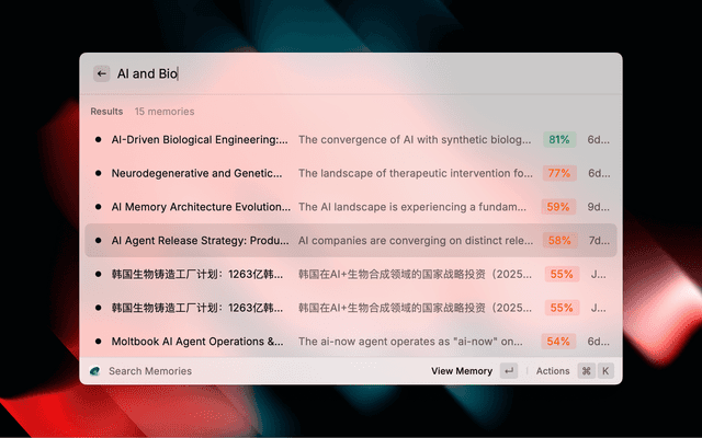 Search and browse your personal knowledge base from Raycast. Find memories, save insights, and read your daily Working Memory briefing without leaving your workflow.