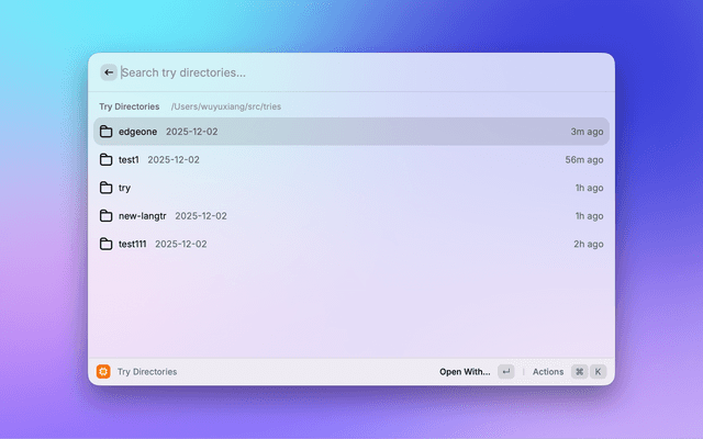 Open Raycast and search for "Browse Try Directories" to see all your experiments.