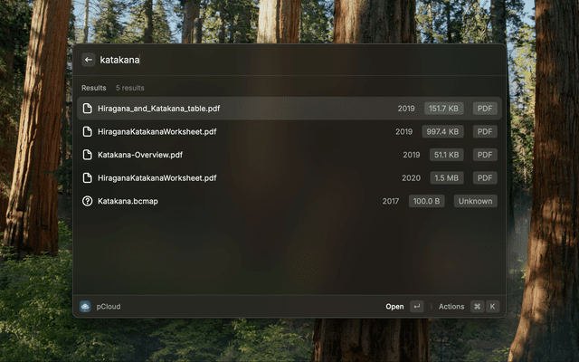 This extension allows you to interact with your pCloud files. Search them through the pCloud APIs, open them directly in Finder using your pCloud Drive.