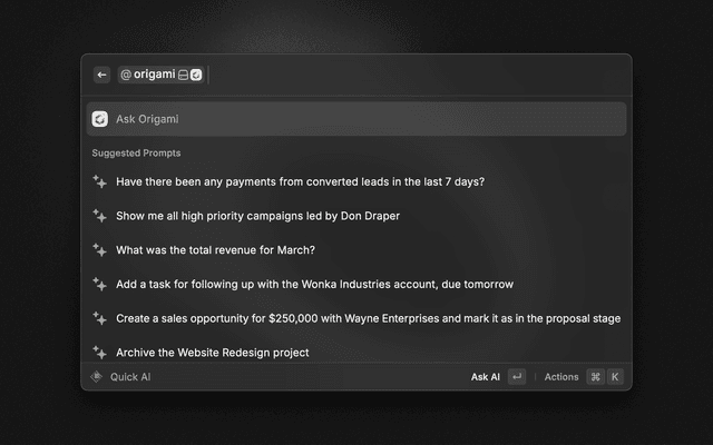 This extension integrates with Raycast's AI features, providing tools to retrieve and interact with your Origami data. You can use natural language commands to work with your Origami data directly from Raycast's AI interface, without needing to navigate the Origami web interface.