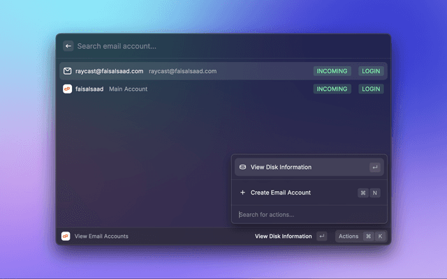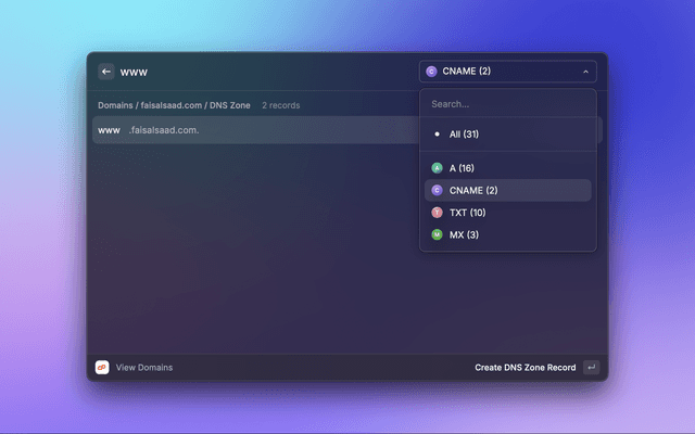 This is a Raycast extension for cPanel User level accounts (Admin and Reseller not supported). With this extension you can View Domains and their DNS Zones, Email Accounts and their Disk Usage.