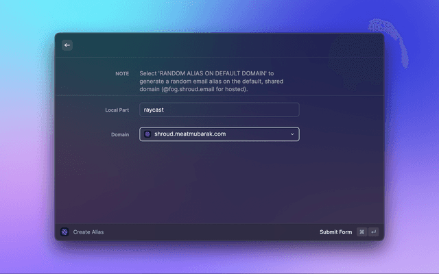 This is a Raycast extension for Shroud.email. With this extension, you can View Domains and Create or View Aliases in your Shroud.email instance.