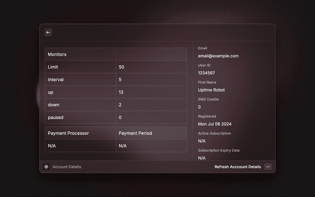 Follow instructions from https://uptimerobot.com/api/#auth to get the KeyCopy and Paste this in PreferencesThe Free Plan is limited to 10 req/min so once data is fetched, it is stored Locally and not refreshed (refetched) until 24 hours have passed. You can easily refresh/refetch manually through the Action.