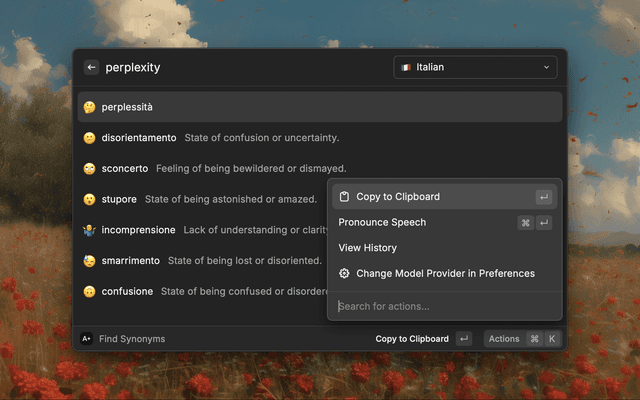 This Raycast extension allows you to search for synonyms using a Language Model (LLM) such as OpenAI, Grok, or Anthropic, with your own API keys.