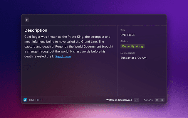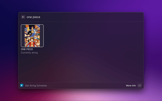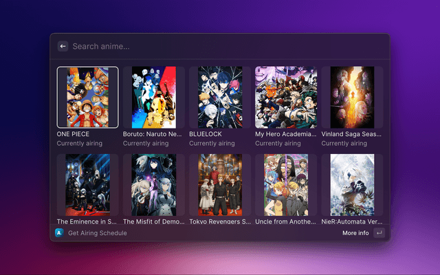 This extension pulls data from Anilist, mainly the airing schedule. Additionally, you can also open the anime to watch on one of the available streaming sites from Raycast itself.