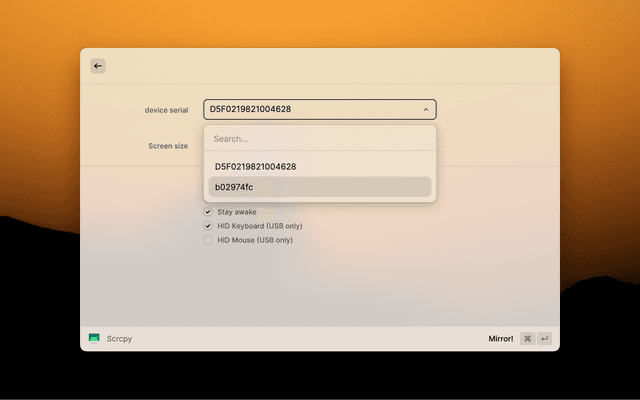 Everything from scrcpy with neat GUI provided by Raycast! Plug in your android phone and start mirror with one click.
