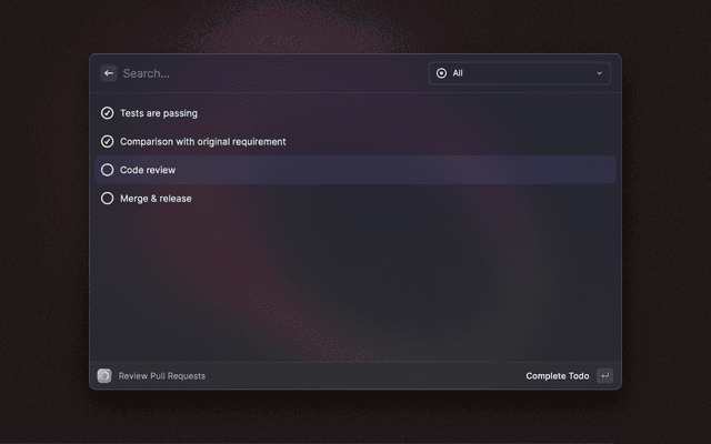 Checklist is a simple - Raycast native - app that allows you to create and work on checklists. Based on The Checklist Manifesto you know checklists can save lives and make you more productive by improving the quality of repetitive tasks. Checklist lets you create, edit and delete checklists. You can easily start working on them and keep track of the progress.